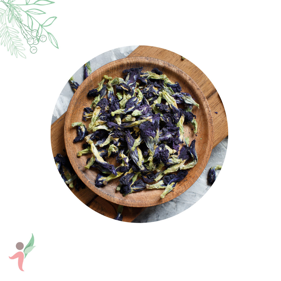 Butterfly-pea bloemen; Een cafeïne-vrije kruidenthee gemaakt van een afkooksel of een infuus van de bladeren van de kittelbloem (met bijvoorbeeld gedroogd citroengras)